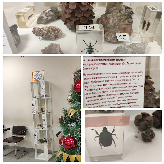 В отделении ГОБУ «МФЦ МО» по городу Полярные Зори в рамках проекта «МФЦ – Мир на ладони» организована выставка «Мастерская природы». Посетители могут рассмотреть камни и минералы, найденные на территории Мурманской области, а также кусочки застывшей лавы вулкана, экзотических жуков, обитателей морей и океанов, шишки хвойных растений, привезенные из разных мест мира.